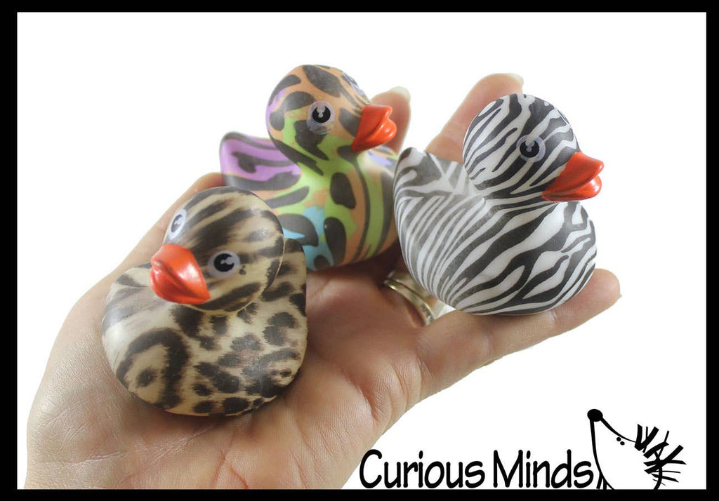 Discover the Random Color Animal Print Rubber Duck set from Curious Minds Toys. This 50-pack features 2-inch ducks in zebra, cheetah, and mixed prints, packaged in a clear bag with no individual tags. Ideal as affordable rewards for classrooms, offices, carnivals, and goody bags, these bright bath toys spark instant smiles.