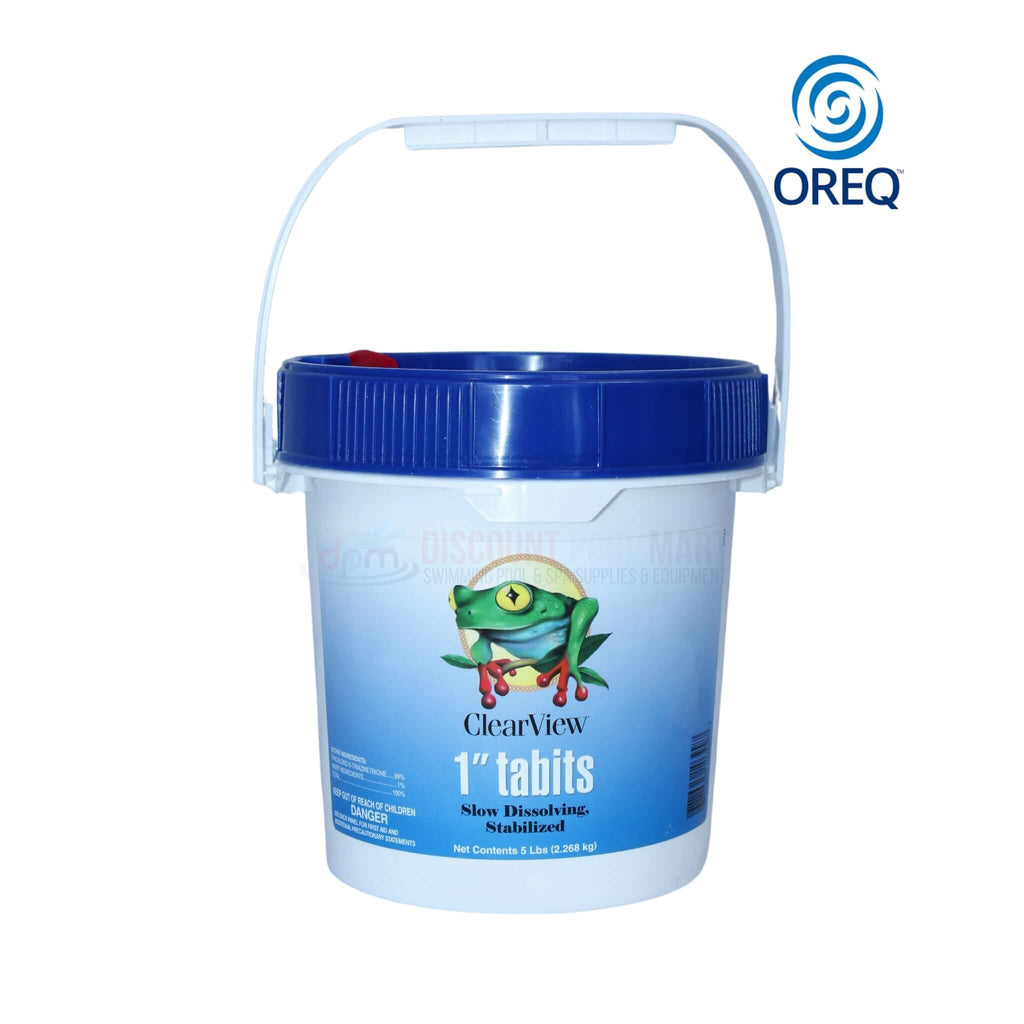 ClearView 1" Tabits Slow Dissolving Chlorine Tablets CVTS005 are a premium sanitizer designed to deliver long-lasting, consistent chlorine release for pools and spas. Packaged in a sturdy 5 lb bucket with a blue lid and a convenient white carry handle, these 1-inch tabs dissolve slowly to provide reliable sanitization and help keep water crystal-clear, free from bacteria, algae, and other contaminants.