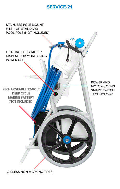 Duckies Pool Supply presents the Hammerhead Service Vacuum HH9130-60, a professional-grade pool cleaning system designed for service technicians and demanding commercial use. This model pairs a wide 21-inch head with a long 60-foot cord, rugged caddy cart and convenient truck/trailer hitch mount for fast, efficient cleanups.