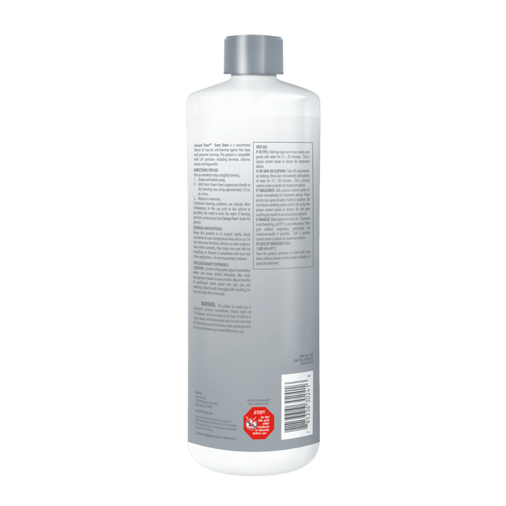 Introducing Leisure Time Foam Down, a concentrated foam remover that restores calm to your spa in seconds. This powerful formula begins working immediately to eliminate foam—no waiting, no fuss. Shake, apply ½ oz directly to the foaming area, and watch the foam disappear, revealing a foam-free relaxation. This concentrated formula delivers foam-free relaxation and longer-lasting suppression, so you spend less time addressing foam and more time enjoying your spa. Compatible with chlorine, bromine, ozone and biguanide sanitizers, it fits seamlessly into your routine. Available in a 32 fl oz bottle from the trusted Leisure Time brand.