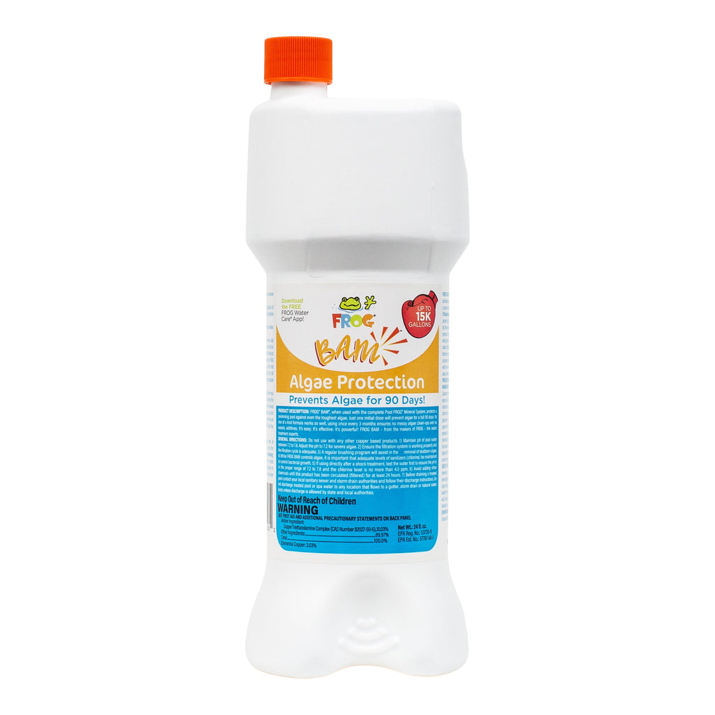 Introducing Pool Frog BAM! Algae KNOCK-OUT CHAMP 90-Day Algae Protection, a proven algaecide from King Technology INC. This robust formula comes in a compact, easy-to-use bottle with an orange cap, designed to work seamlessly with Frog or Cycler feeder systems. When proper chemical balances are maintained, it can keep your pool algae-free for up to 90 days.