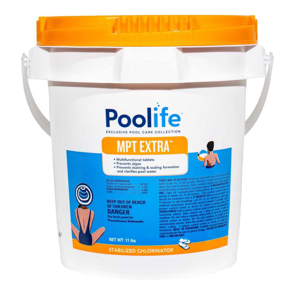 Poolife MPT Extra is a proprietary and patented 4-in-1 3 inch chlorine tablet. These tablets sanitize, prevent algae, staining and scaling and clarity and soften your pools water. These can be used in chlorine floaters, feeders or skimmers and are sun protected to extend chlorine.