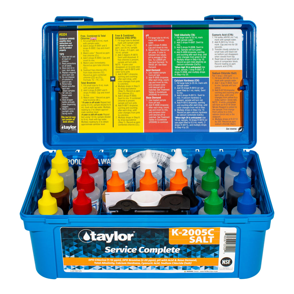 Ensure your pool or spa is always in pristine condition with the Taylor K-2005C-SALT Service Complete Test Kit. This exceptional testing kit from Duckies Pool Supply makes it easy to measure various water chemistry elements, allowing you to maintain a safe and enjoyable swimming environment.