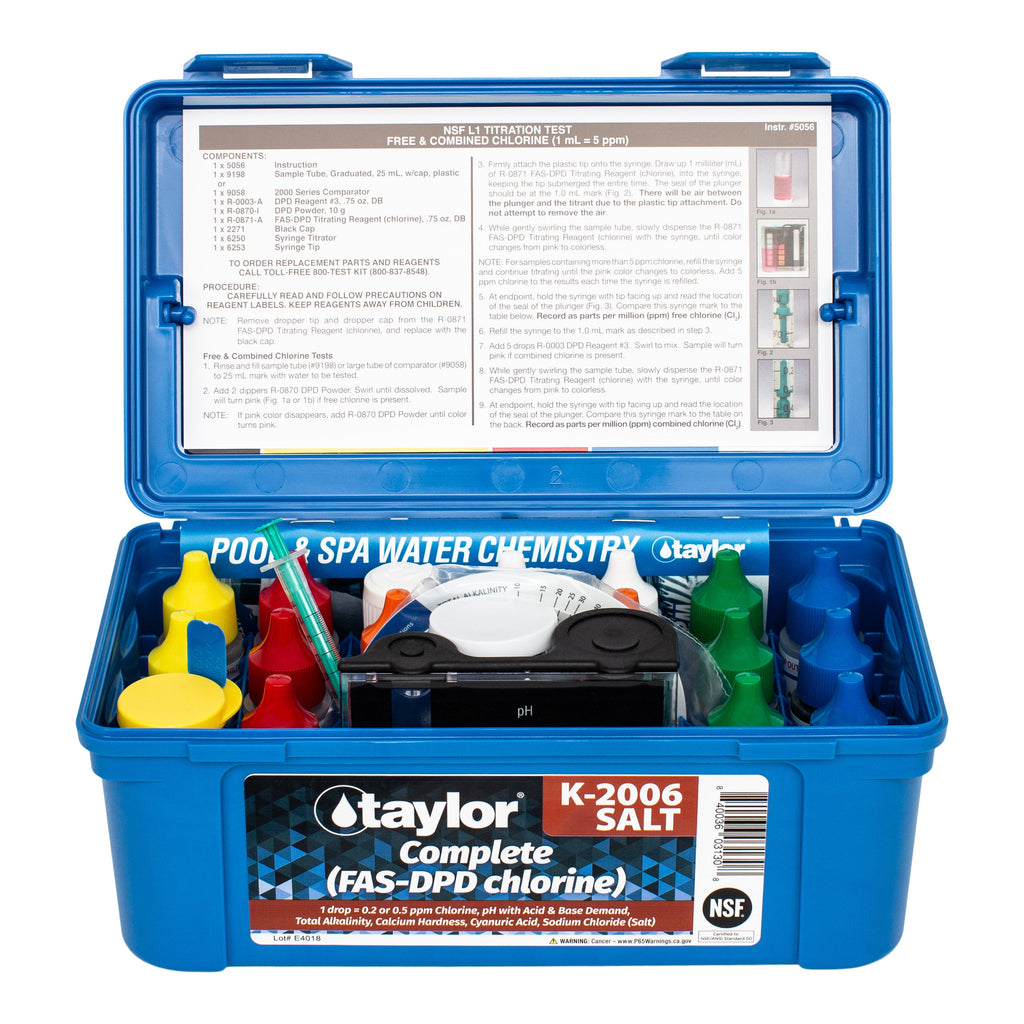Ensure your pool water is pristine and perfectly balanced with the Taylor K-2006-SALT Complete (FAS-DPD Chlorine) Test Kit from Duckies Pool Supply. This exceptional kit is designed for pool owners who demand accuracy and reliability in water testing.